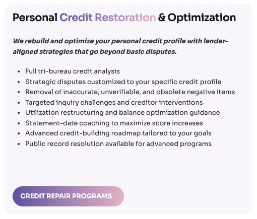 Stop guessing what lenders want. We prep your file for approvals, clean the negatives that block you, and sequence applications so you can secure cards, lines, and loans with confidence.